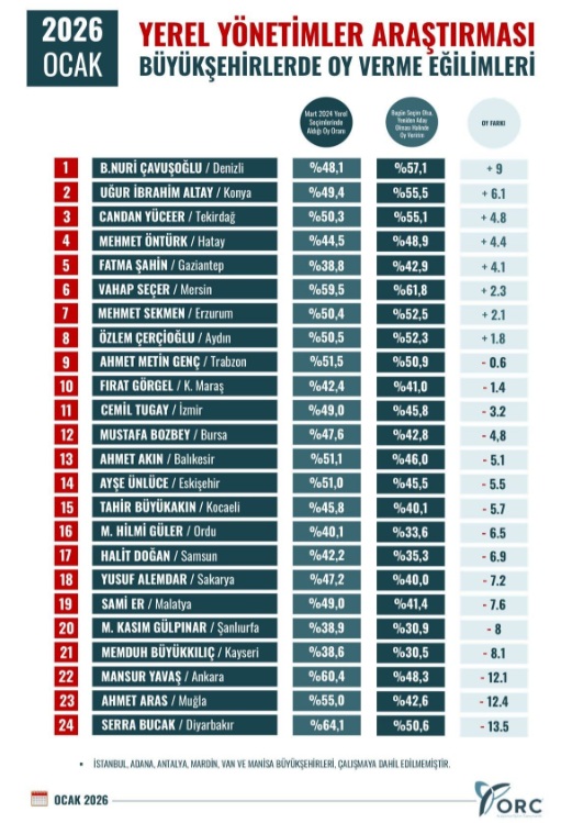 ORC Araştırma’nın verileri, bazı büyükşehirlerde mevcut başkanların seçmen desteğini artırdığını ortaya koyarken, Kocaeli’nin de aralarında bulunduğu birçok kentte seçmen eğilimlerinde düşüş yaşandığını gösterdi.