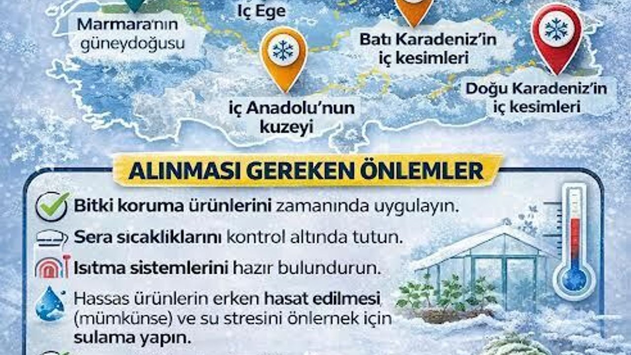 yönelik öneriler arasında bitki koruma ürünlerinin zamanında uygulanması, seralarda sıcaklık değerlerinin kontrol edilmesi, ısıtma sistemlerinin hazır bulundurulması ve hassas ürünlerin mümkünse erken hasat edilmesi yer aldı. Ayrıca su stresini azaltmak için ihtiyaç halinde sulama yapılmasının faydalı olacağı ifade edildi.