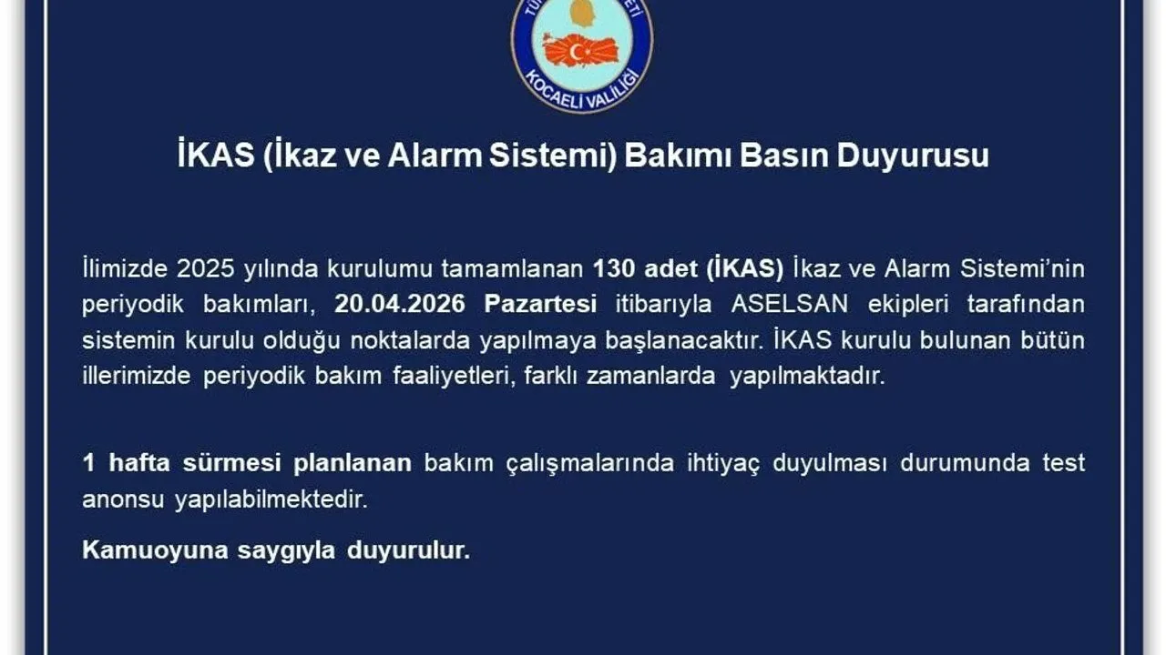 Kocaeli’de 2025 yılında kurulumu tamamlanan 130 adet İkaz ve Alarm Sistemi (İKAS), 20 Nisan 2026 Pazartesi günü itibarıyla ASELSAN ekiplerince periyodik bakıma alındı. İl genelinde kritik noktalara yerleştirilen sistemlerin düzenli kontrolü, olası afet ve acil durumlarda halkın hızlı şekilde bilgilendirilmesi açısından büyük önem taşıyor. Emniyet ve kamu kurumlarıyla koordineli yürütülen çalışmaların bir hafta sürmesi planlanıyor.