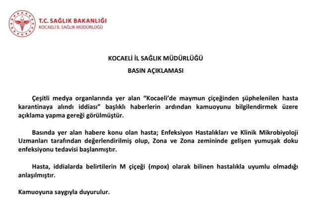 Kocaeli Sağlık Müdürlüğü, kentte tedavi altında olan kişinin maymun çiçeği (mpox) hastası olmadığı bilgisini verdi. İl Sağlık Müdürlüğü, medya organlarında çıkan "Kocaeli'de maymun çiçeğinden şüphelenilen hasta karantinaya alındı" haberlerinin ardından kamuoyunu bilgilendirme gereği duydu.